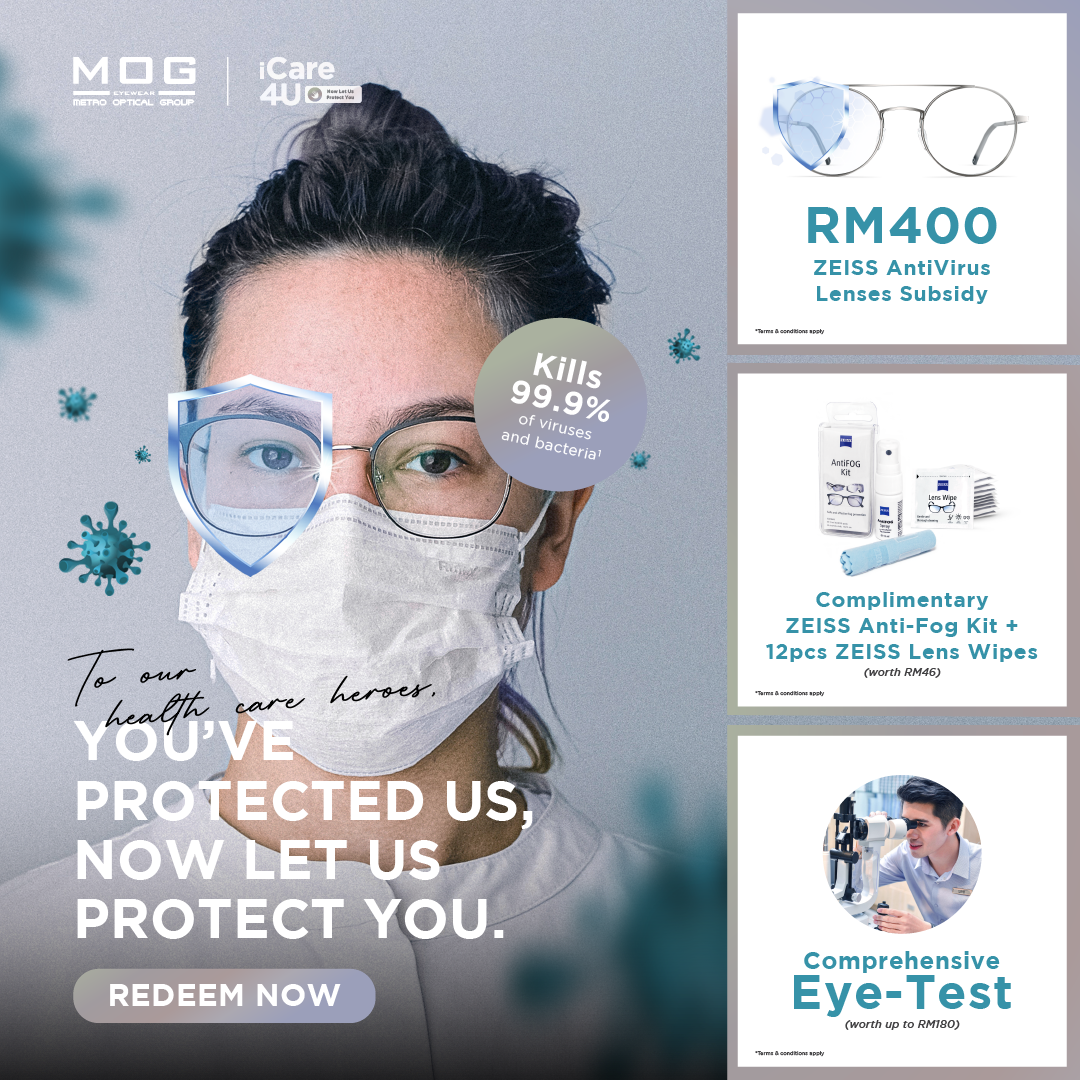 The iCare4U programme, organised by MOG will be extended to the first 10,000 medical front-liners. The subsidy will mainly include a RM400 aid for AntiVirus Lenses made by German renowned lensmaker, ZEISS.