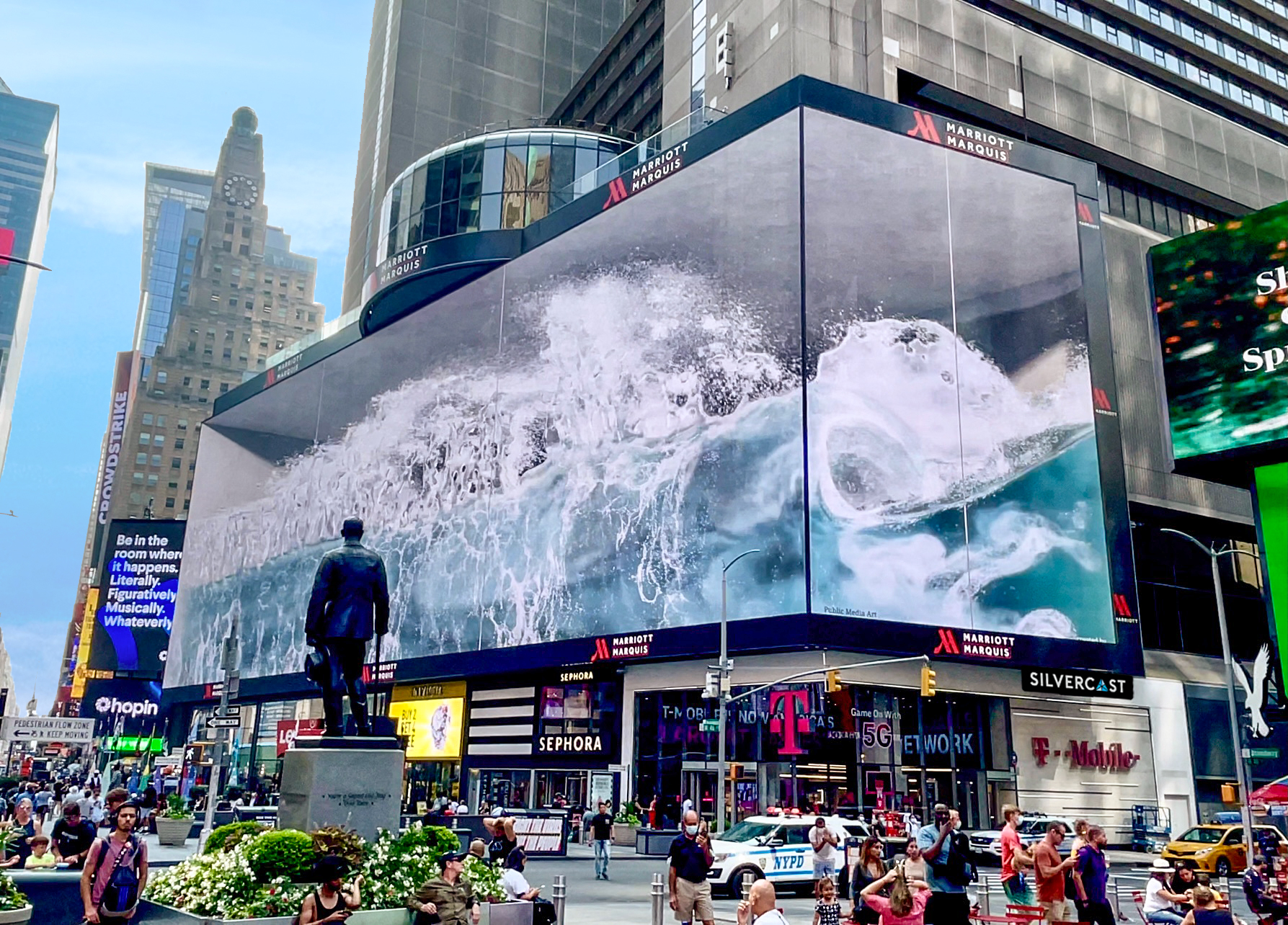Appearing on SILVERCAST’s 30,000 sq. ft. iconic Times Square digital spectacular known as “Big Kahuna” will be a media art execution titled WHALE. Illuminating the pedestrian plaza, the public media art display will transform the enormous screen into a hyper-realistic, undulating ocean environment occupied by a massive blue whale. The whale is made of water and will move freely and harmoniously among the waves.