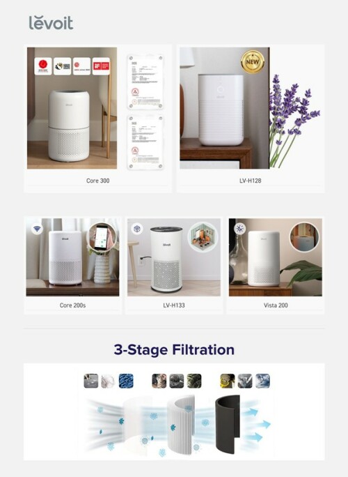 Most of Levoit air purifiers use thorough 3-stage filtration, typically consisting of a Preliminary Filter, an H13 True HEPA Filter, and an Activated Carbon Filter. The H13 True HEPA Filter removes at least 99.97% of airborne particles 0.3 micrometers (µm) in diameter, capturing small particles and common allergens such as pollen and dust. Combined, the stages offer excellent filtration, with different Levoit models catering to different room sizes.