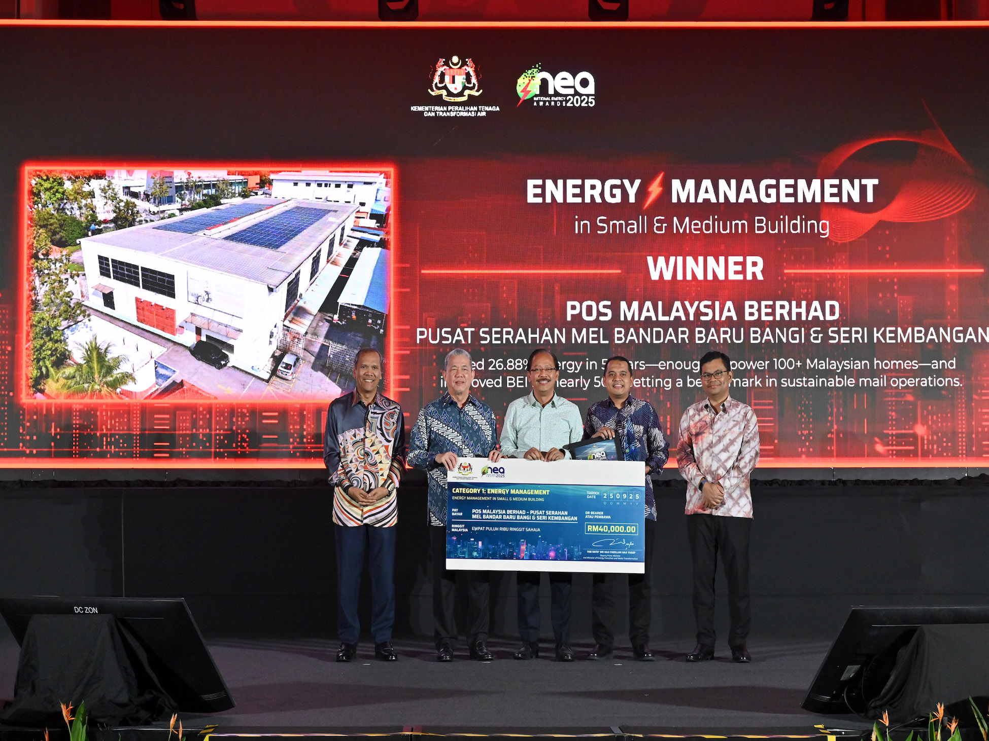 National Energy Awards 2025 (NEA) – Pos Malaysia secured three accolades for energy management excellence at the prestigious NEA ceremony, organised by the Ministry of Energy Transition and Water Transformation (PETRA) and officiated by Deputy Prime Minister YAB Datuk Seri Fadillah Yusof at Hilton Hotel, Kuala Lumpur.