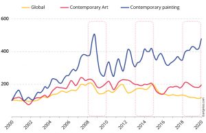 Over the past twenty years the exchange of Contemporary art works has developed into a dynamic global market. In its upcoming publication, Artprice traces and analyzes this evolution, from its rapid acceleration culminating in Damien Hirst’s incredible sale at Sotheby’s in September 2008 the day Lehmann Brothers collapsed, then its vigorous recovery with the boom in Chinese Contemporary art driving the market until 2014, followed by a period of relatively measured growth… and suddenly interrupted in March 2020, by the unprecedented global health crisis we are now experiencing.