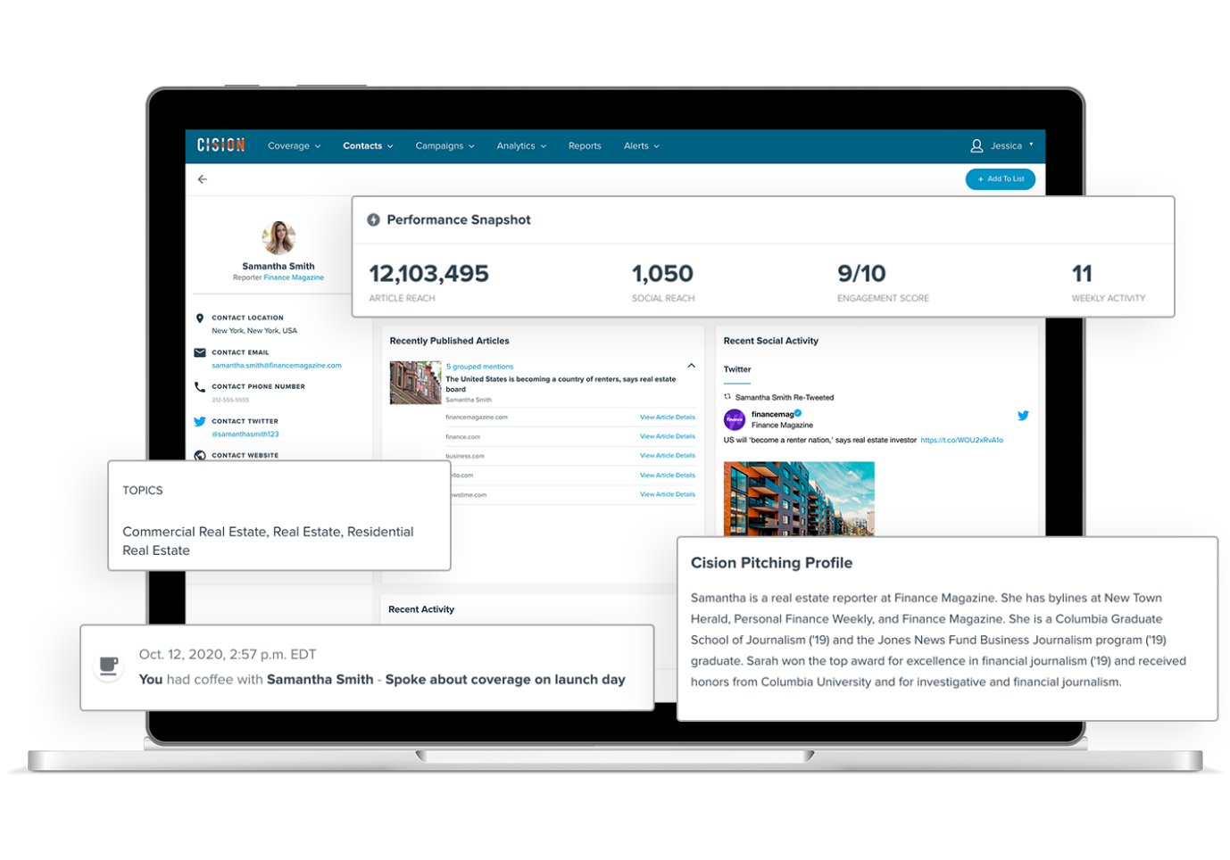 - Curated, master profiles: Powerful profiles which include more contact information, performance metrics, social profiles, pitching tips and content streams. Cision Connect automatically links media contacts with their coverage, making it easy to see the most recent articles from journalists and identify reporters based on the content they’re publishing.