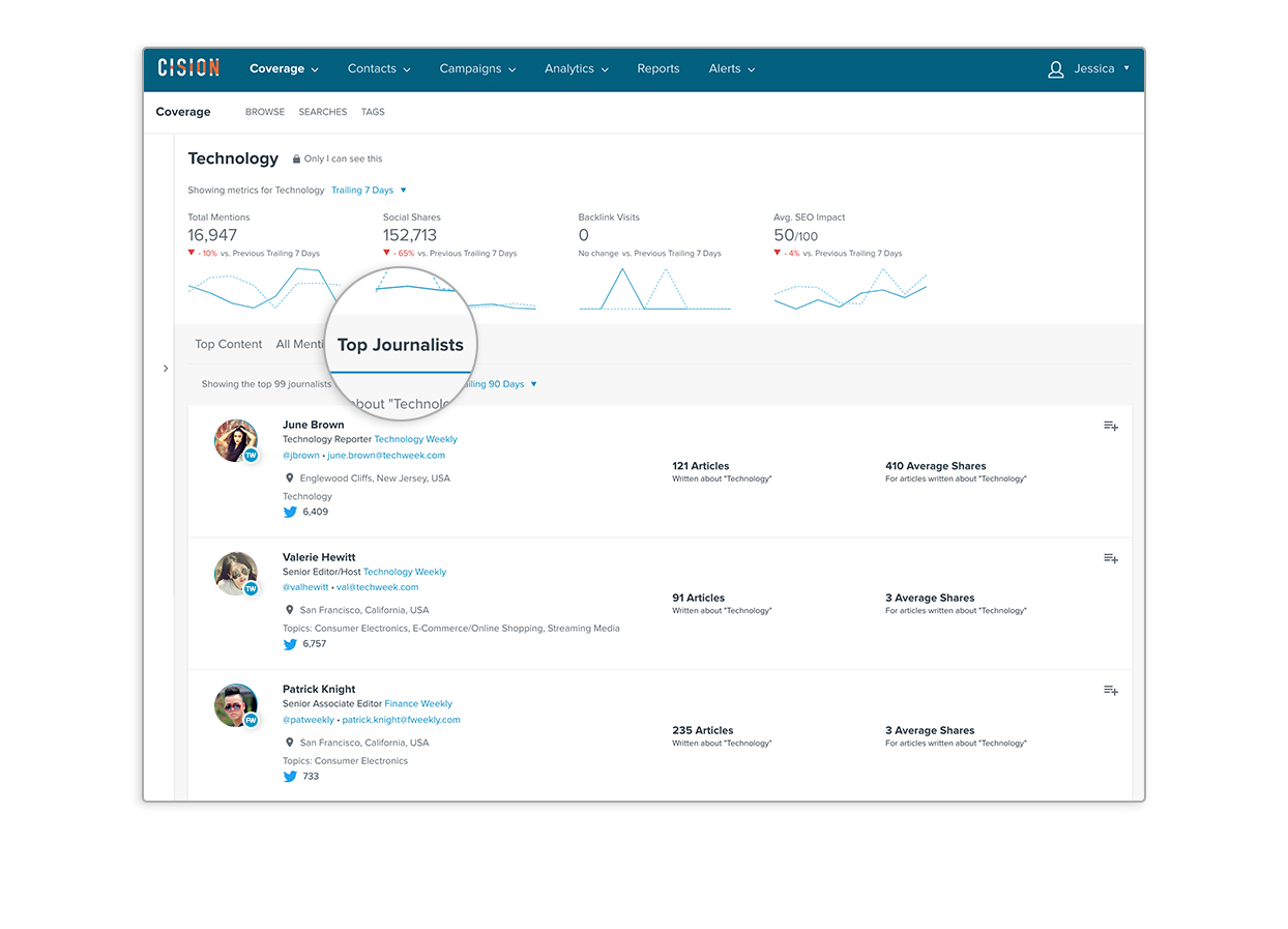 Complete with intuitive searching and intelligent filtering technology, Cision Connect allows users to easily discover media profiles of the journalists and social influencers that are most relevant to them. Media profiles now provide supplemental information about reporters and influencers including their latest social media activity, recently published articles and article reach, empowering communicators to personalize pitches for improved earned media results.