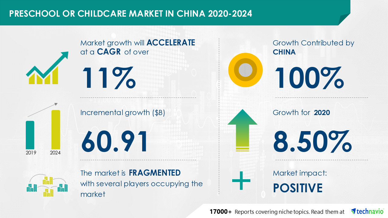 Technavio has been monitoring the preschool or childcare market and it is poised to grow by USD 60.91 billion during 2020-2024, progressing at a CAGR of over 11% during the forecast period. The report offers an up-to-date analysis regarding the current market scenario, latest trends and drivers, and the overall market environment.