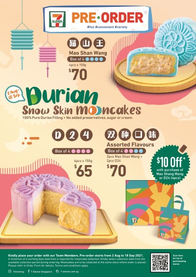 | Mao Shan Wang Mooncakes (4pcs) | $70 | Enjoy $10 off Assorted Flavours Mooncakes (4pcs) with purchase of Mao Shan Wang Mooncakes (4pcs) or D24 Mooncakes (4pcs) | 2 Aug – 18 Sep 2021 |