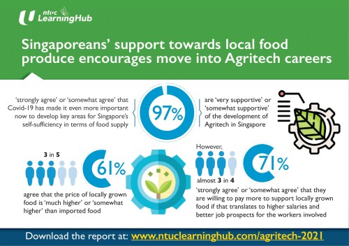 “With considerable private and government investments into Singapore’s Agritech industry, this is an opportune time for those keen on joining the sector to contribute greatly to our nation’s goal towards food security and sustainability. It is an emerging sector, which from the survey results, we can see that there is a promising buy-in from the general population. This motivation will encourage more from our local workforce to take on relevant skills and knowledge to drive the Agritech industry,” says Eugene Wong, Chairman of NTUC LHUB.