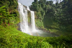 Great waterfall scenery with a rainbow. Tad Yuang, dramatic waterfall drops 40 metres over a cliff and tropical forest. Bolaven Plateau, Paksong, Laos. Rainy season.