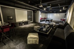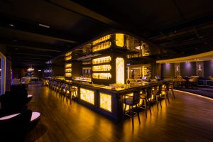 of the bar is the illuminated long and high Onyx Table and barstools perfect to cater to large groups, communal tastings or wine dinner events. Different types of high seating arrangements can also be found at the “Beer Barrel” and “Chess” tables. For those with a more sophisticated preference, a Cigar Lounge, where retro glamour meets contemporary style is chic yet relaxed. Enjoy the company of friends over a nightcap and fine cigar while listening to the soft sounds of smooth jazz and seductive lounge music.