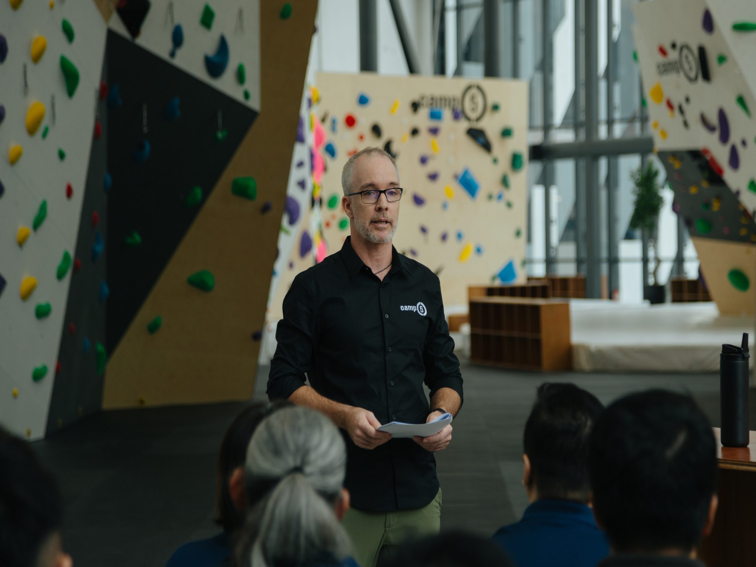 It took the Camp5 route setting team 9 days, 4000 holds, 3000 bolts, and 7000 wood screws to completely cover the walls with routes and boulder problems for climbers to test themselves on. Top-rope, boulder, and lead climbing are on offer along with training boards and other suspension and weights training facilities. Jeremy Peet, Managing Director of Camp5 Climbing Gym then hosted a tour of the world-class facility.