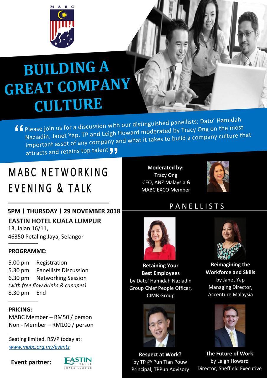 MABC Networking Evening & Talk: Building A Great Company CultureBy News Hub Asia Reporter - November 27, 2018FacebookTwitterPinterestWhatsAppLinkedinEmailTelegram 29 Nov 20185:00 PM – 8:30 PMLocation: Eastin Hotel Kuala Lumpur, 13, Jalan 16/11, 46350 Petaling JayaRegister at http://www.mabc.org.my/event-2967446/Registration