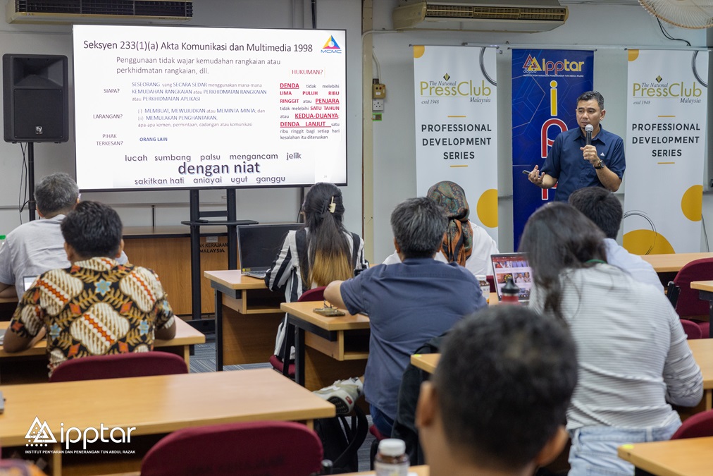 Akmal Hamdy Baharudin, head of the investigation department of the Malaysian Communications and Multimedia Commission (MCMC) presenting the training module on cyber security at the second NPC Professional Development Series (PDS) training programme for journalists held at the Tun Abdul Razak Institute of Broadcasting and Information (IPPTAR) in Kuala Lumpur, Malaysia on 11 January 2024. | Photo by IPPTAR