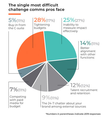 - 25% of respondents say their single biggest challenge is the inability to measure impact effectively; 39% report difficulty aligning PR metrics to revenue and other vital business KPIs.