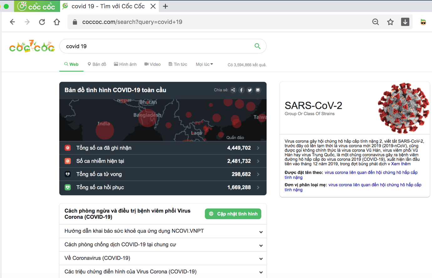 As the progress of the COVID-19 epidemic was getting more complicated in some countries, the amount of traffic in searching for COVID-19 related keywords increased dramatically. However, that facilitated the dissemination of false information, which mainly mentioned the number of COVID-19 positive patients, as well as the methods to prevent the disease. Before the situation of fake news quickly spread on the Internet, Coc Coc launched an updated information page of COVID-19 based on official sources on the Coc Coc search engine on February 10 to provide exact information for users to follow. Coc Coc is one of the first Vietnamese technology companies to develop a COVID-19 information page with such fast access speed and updated information. Users only need to type keywords related to Covid-19 such as “corona virus”, “coronavirus”, “nCoV”, “corona virus”, “2019-nCoV”, ” COVID-19″, “sars-cov-2” on Coc Coc browser (with 24M users) or accessing to the link, a complete news page of the COVID-19 pandemic developments will appear immediately. All necessary information of the disease such as symptoms, prevention methods, recommendations of the Ministry of Health are continually updated in the most concise and intuitive way. Users can look for information from both desktop and mobile, and easily share it with friends and relatives. After launching the news page, Coc Coc has recorded 250 thousand visits daily. And, Coc Coc has become the most popular COVID-19  news one in Vietnam and received a lot of requests from the overseas Vietnamese community to publish it in English version.