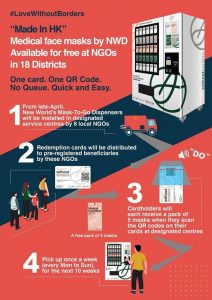 The eight NGOs will provide medical face mask redemption cards or a downloadable mobile app to pre-registered low-income families and communities in need. Those individuals can then exchange a pack of five “Made in HK” masks for free from the dispensers every week for 10 consecutive weeks during the opening hours of the centres. In addition, NWD will continue to donate medical face masks to low-income families and other organisations in need through non-profit organisations and non-governmental organisations.