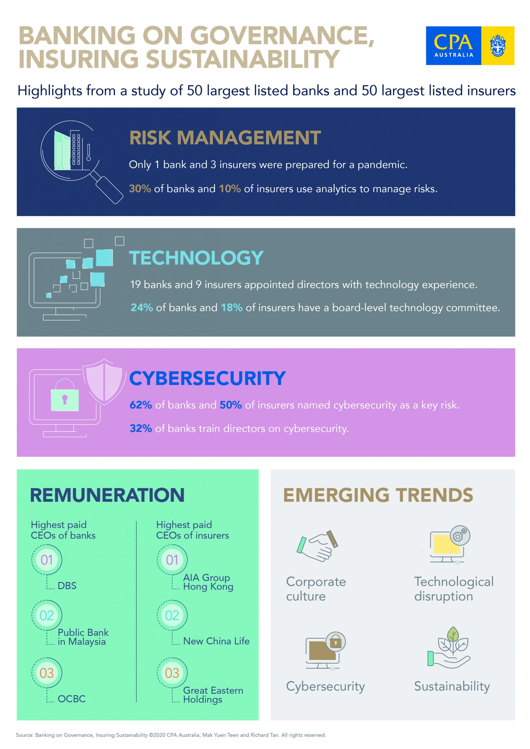 The findings are part of a new report, Banking on Governance, Insuring Sustainability, authored by academics from the National University of Singapore (NUS) Business School, and published by global professional accountancy organisation CPA Australia. The report studies the 50 largest listed banks and 50 largest listed insurance companies by market capitalisation from 15 Asia Pacific economies.
