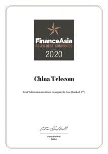 China Telecom Corporation Limited (“China Telecom” or “the Company”; HKEx: 00728; NYSE: CHA) was voted by portfolio managers and analysts around the globe as “No.1 Best Telecommunications Company in Asia“, at the “Asia’s Best Managed Companies Poll 2020″ by FinanceAsia, a reputable financial magazine in Asia. The Company’s Chairman and CEO, Mr. Ke Ruiwen, was voted as “No.2 Best CEO in China“.