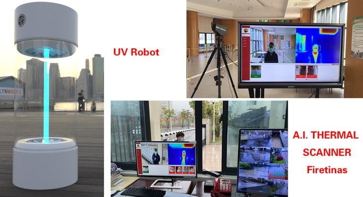 FIretinas is also launching its first UV disinfection robot Vforvictory. The 185nm UV Vforvictory generates O3 killing 99.9% COVID-19 virus in 200sqf in 30 mins operation