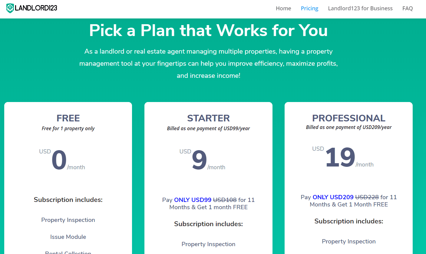 There are currently three subscription packages available in Landlord123: Free, Starter, and Professional. The first – and default – option is Free, and allows users to manage a single property with inspection, issue, and rental collection features included. The second, known as the Starter package, allows the user to manage up to three properties, and includes property inspection, issue module, and rental collection features. The price for the Starter package is $9.00 per month, and billed as $99 a year.