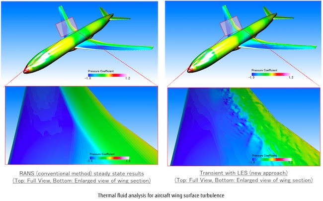 During flight, an aircraft may experience a vibration phenomenon called buffet, which affects its safety and flight stability. Predicting buffet vibration is an important issue for aircraft safety design. This time, by executing the thermal fluid analysis application Cradle CFD | scFLOW (3) in parallel using the maximum possible 192,000 out of Fugaku’s total number of CPU cores (4) of Fugaku and analyzing a high-definition model of 237 million elements with LES (5), which is an analysis method capable of expressing fine vortexes, it was possible to observe a phenomenon whereby pressure vibration and fine vortexes are generated on the surface of the blade. This makes it possible to predict the buffet effect in greater detail than the conventional RANS (6) analysis method using a coarse calculation grid. This proved that large-scale analyses leading to the safe design of aircraft taking into account the buffet could be calculated.