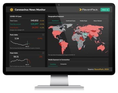 The RavenPack Coronavirus News Monitor is different from other coronavirus dashboards in that it summarizes emotions or sentiments from tens of millions of news articles and public posts into simple indicators, similar to stock tickers.